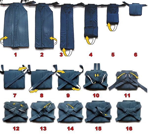 Les sept plis du Hakama, dont 5 devant et 2 derrière, symbolisent les sept vertus du Bushido (la voie du guerrier)
